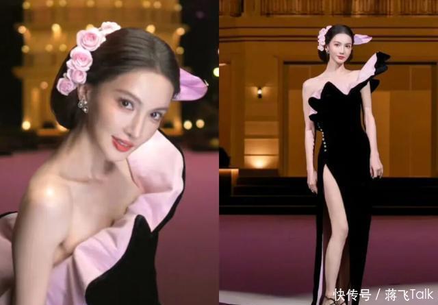 金晨穿了一条内粉外黑高开衩长裙,抛开抢镜的鼻子和嘴,个人觉得发型也不适合她。